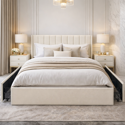 Beige Wingback Upholstered Platform Bed with 4 Drawers