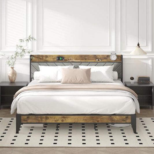 Wooden Platform Bed with Upholstered Headboard, Charging Station