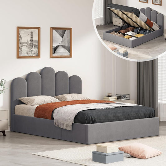Grey Velvet Hydraulic Storage Platform Bed